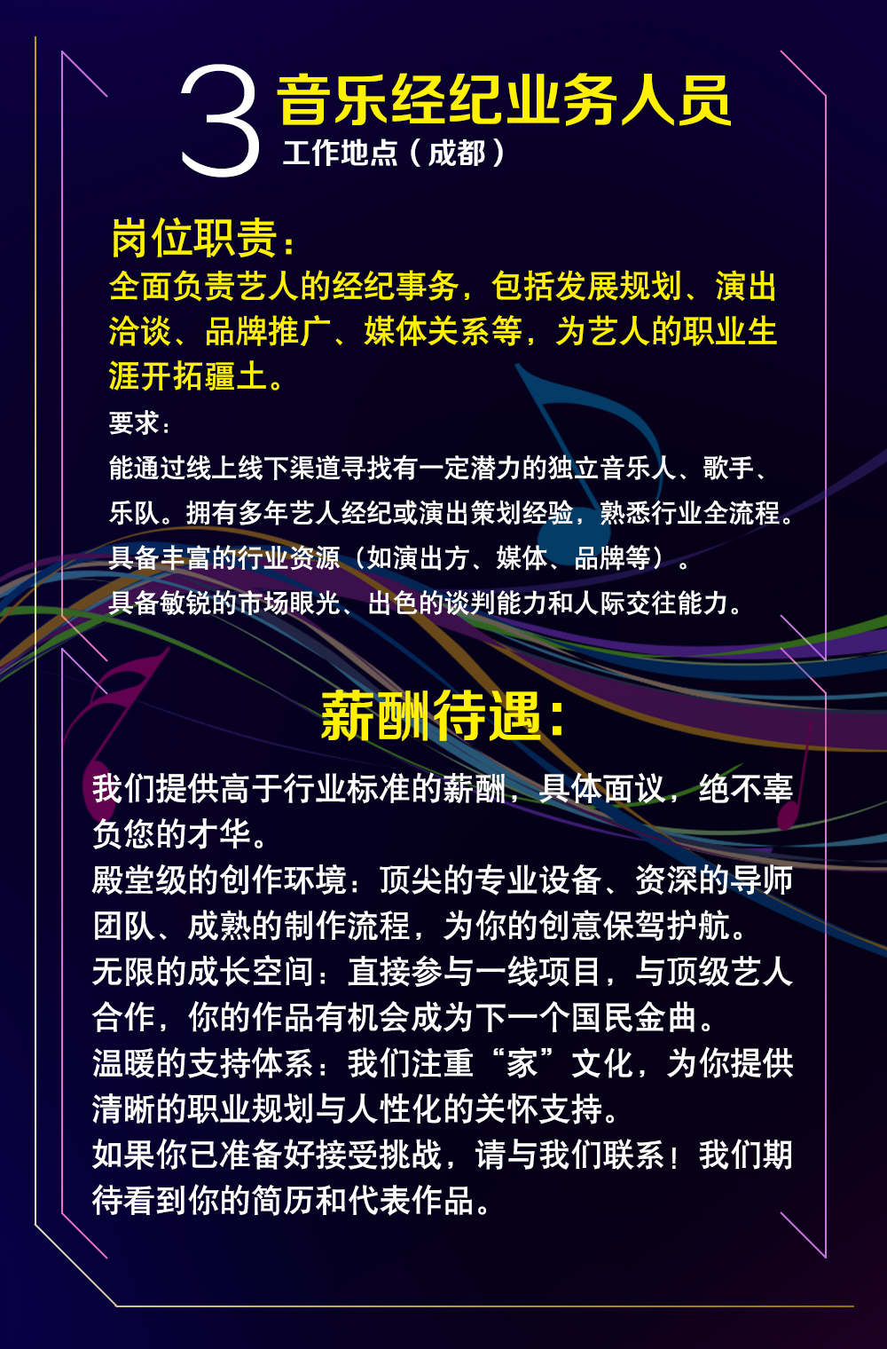 3、 音乐经纪业务人员(工作地点:成都)