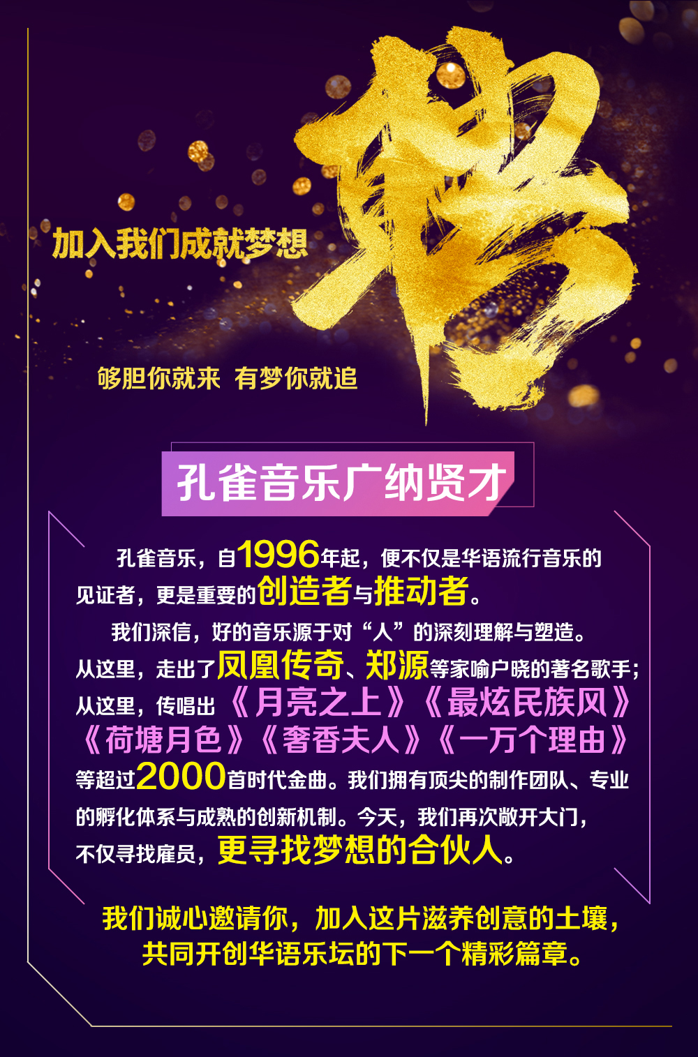 我们拥有顶尖的制作团队、专业的孵化体系与成熟的创新机制。今天,我们再次敞开大门,不仅寻找雇员,更寻找梦想的合伙人。我们诚心邀请你,加入这片滋养创意的土壤,共同开创华语乐坛的下一个精彩篇章。