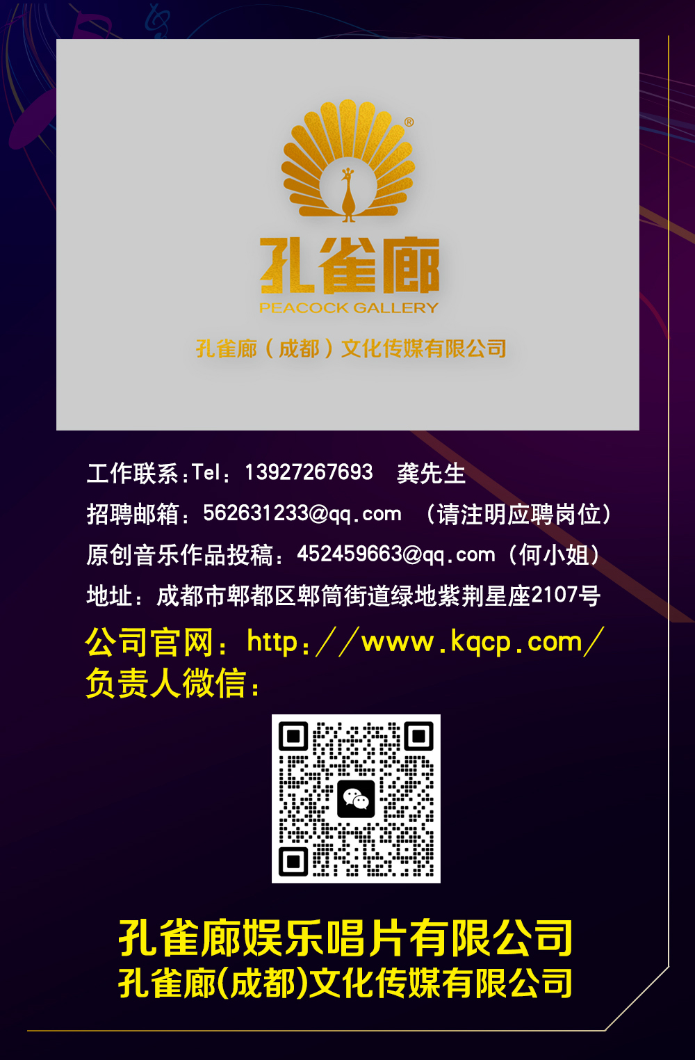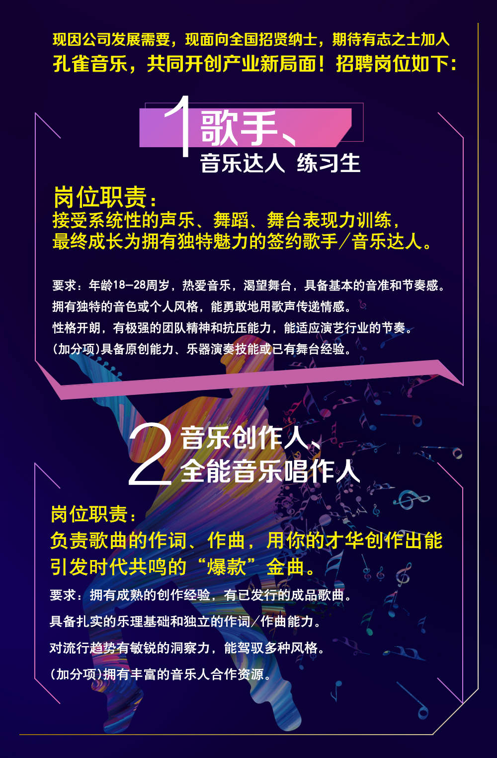 现因公司发展需要,现面向全国招贤纳士,期待有志之士加入孔雀廊音乐,共同开创产业新局面!招聘岗位如下: